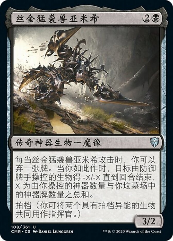 | Rules | Whenever Armix, Filigree Thrasher attacks, you may discard a card. When you do, target creature defending player controls gets -X/-X until end of turn, where X is the number of artifacts you control plus the number of artifact cards in your graveyard. Partner (You can have two commanders if both have partner.) |