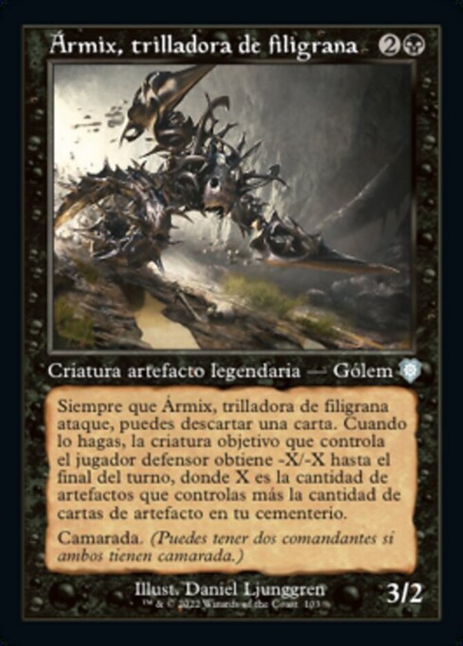 | Rules | Whenever Armix, Filigree Thrasher attacks, you may discard a card. When you do, target creature defending player controls gets -X/-X until end of turn, where X is the number of artifacts you control plus the number of artifact cards in your graveyard. Partner (You can have two commanders if both have partner.) |