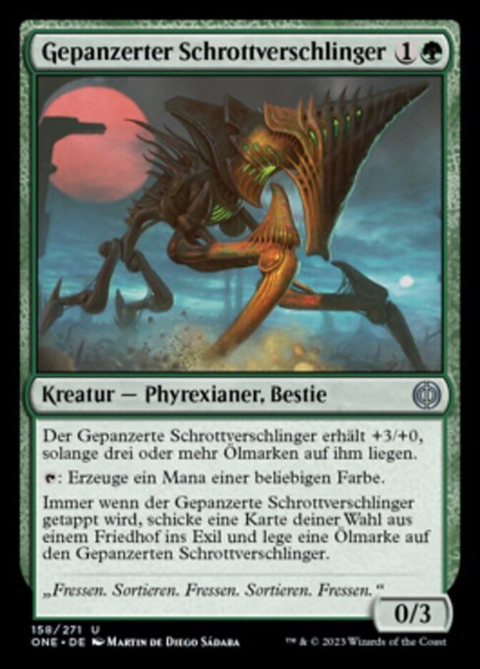 | Rules | Armored Scrapgorger gets +3/+0 as long as it has three or more oil counters on it. : Add one mana of any color. When Armored Scrapgorger becomes tapped, exile target card from a graveyard and put an oil counter on Armored Scrapgorger. |