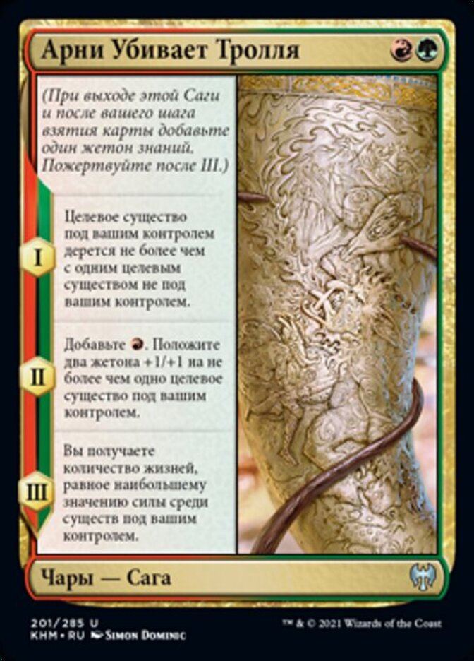 | Rules | (As this Saga enters and after your draw step, add a lore counter. Sacrifice after III.) I — Target creature you control fights up to one target creature you don't control. II — Add . Put two +1/+1 counters on up to one target creature you control. III — You gain life equal to the greatest power among creatures you control. |