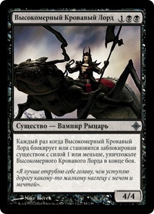 | Rules | Whenever Arrogant Bloodlord blocks or becomes blocked by a creature with power 1 or less, destroy Arrogant Bloodlord at end of combat. |