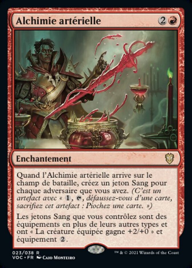 | Rules | When Arterial Alchemy enters the battlefield, create a Blood token for each opponent you have. (It's an artifact with ", , Discard a card, Sacrifice this artifact: Draw a card.") Blood tokens you control are Equipment in addition to their other types and have "Equipped creature gets +2/+0" and equip . |