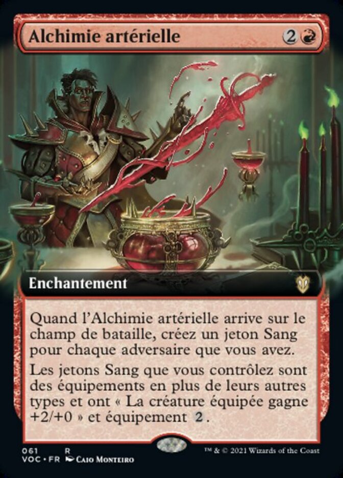 | Rules | When Arterial Alchemy enters the battlefield, create a Blood token for each opponent you have. (It's an artifact with ", , Discard a card, Sacrifice this artifact: Draw a card.") Blood tokens you control are Equipment in addition to their other types and have "Equipped creature gets +2/+0" and equip . |