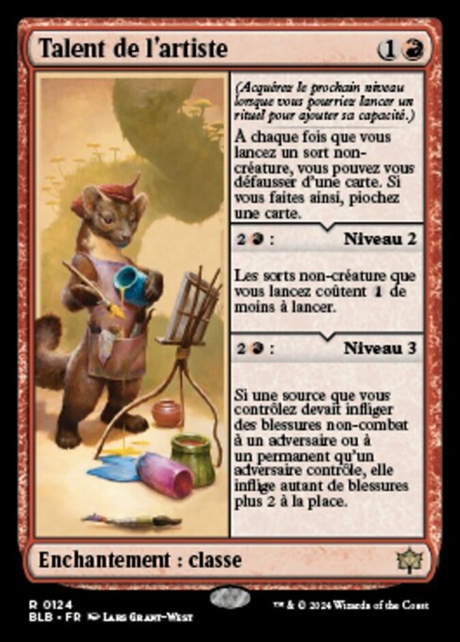 | Rules | (Gain the next level as a sorcery to add its ability.) Whenever you cast a noncreature spell, you may discard a card. If you do, draw a card. : Level 2 Noncreature spells you cast cost less to cast. : Level 3 If a source you control would deal noncombat damage to an opponent or a permanent an opponent controls, it deals that much damage plus 2 instead. |