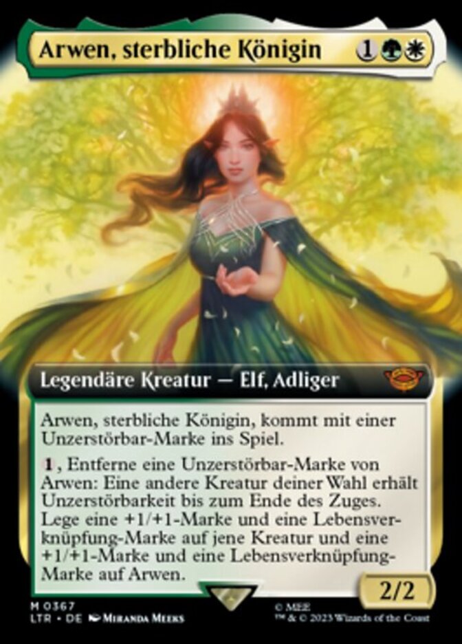 | Rules | Arwen, Mortal Queen enters the battlefield with an indestructible counter on it. , Remove an indestructible counter from Arwen: Another target creature gains indestructible until end of turn. Put a +1/+1 counter and a lifelink counter on that creature and a +1/+1 counter and a lifelink counter on Arwen. |