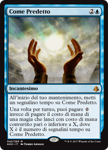 | Rules | At the beginning of your upkeep, put a time counter on As Foretold. Once each turn, you may pay rather than pay the mana cost for a spell you cast with mana value X or less, where X is the number of time counters on As Foretold. |