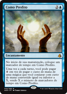 | Rules | At the beginning of your upkeep, put a time counter on As Foretold. Once each turn, you may pay rather than pay the mana cost for a spell you cast with mana value X or less, where X is the number of time counters on As Foretold. |