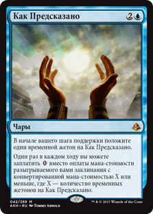 | Rules | At the beginning of your upkeep, put a time counter on As Foretold. Once each turn, you may pay rather than pay the mana cost for a spell you cast with mana value X or less, where X is the number of time counters on As Foretold. |