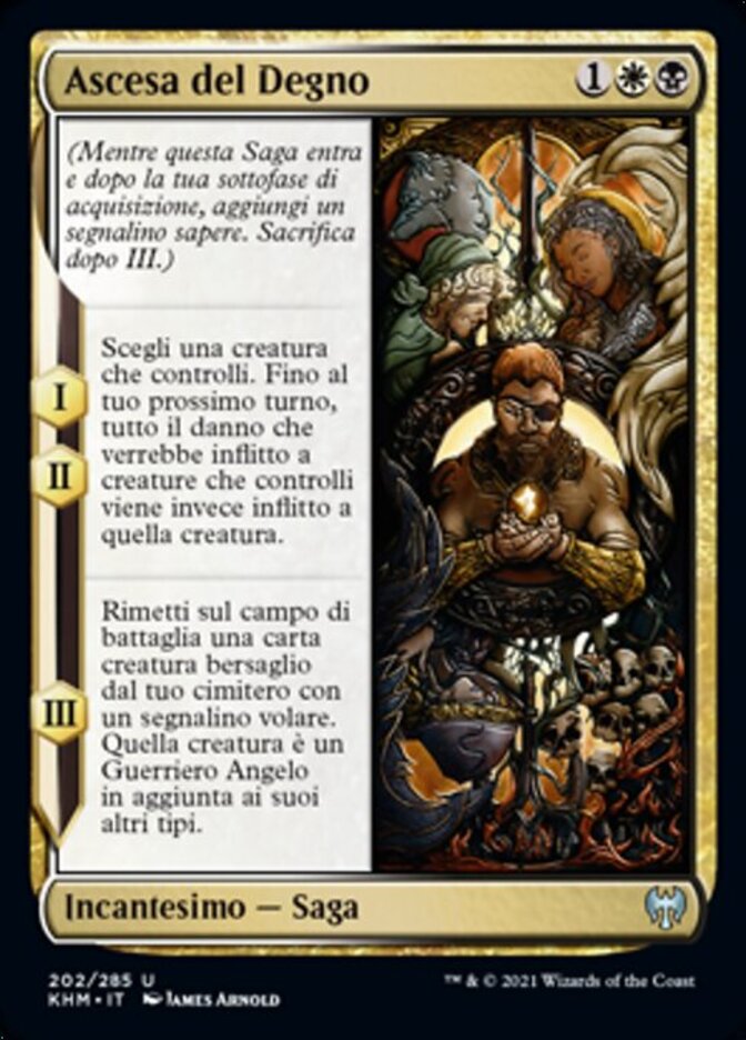 | Rules | (As this Saga enters and after your draw step, add a lore counter. Sacrifice after III.) I, II — Choose a creature you control. Until your next turn, all damage that would be dealt to creatures you control is dealt to that creature instead. III — Return target creature card from your graveyard to the battlefield with a flying counter on it. That creature is an Angel Warrior in addition to its other types. |