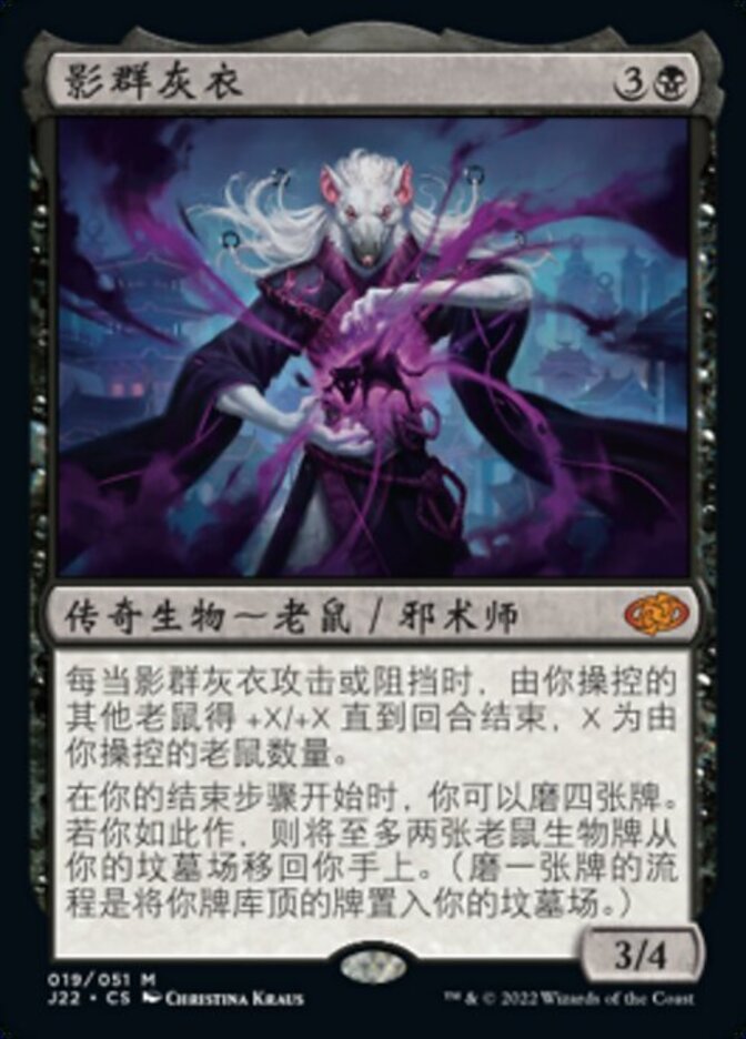 | Rules | Whenever Ashcoat of the Shadow Swarm attacks or blocks, other Rats you control get +X/+X until end of turn, where X is the number of Rats you control. At the beginning of your end step, you may mill four cards. If you do, return up to two Rat creature cards from your graveyard to your hand. (To mill a card, put the top card of your library into your graveyard.) |