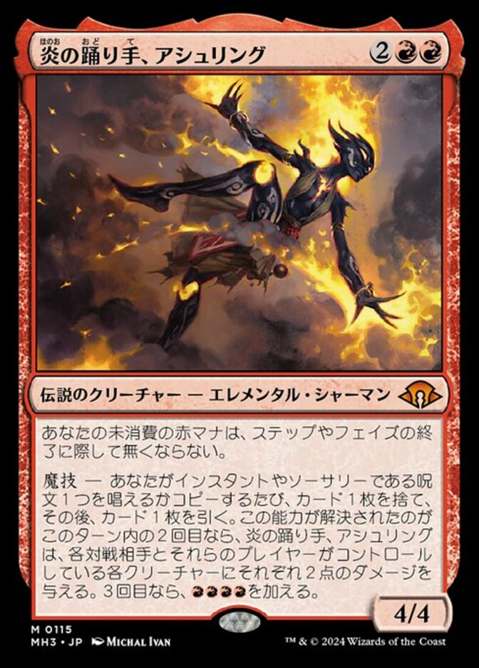 | Rules | You don't lose unspent red mana as steps and phases end. Magecraft — Whenever you cast or copy an instant or sorcery spell, discard a card, then draw a card. If this is the second time this ability has resolved this turn, Ashling, Flame Dancer deals 2 damage to each opponent and each creature they control. If it's the third time, add . |