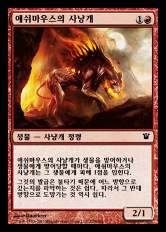 | Rules | Whenever Ashmouth Hound blocks or becomes blocked by a creature, Ashmouth Hound deals 1 damage to that creature. |