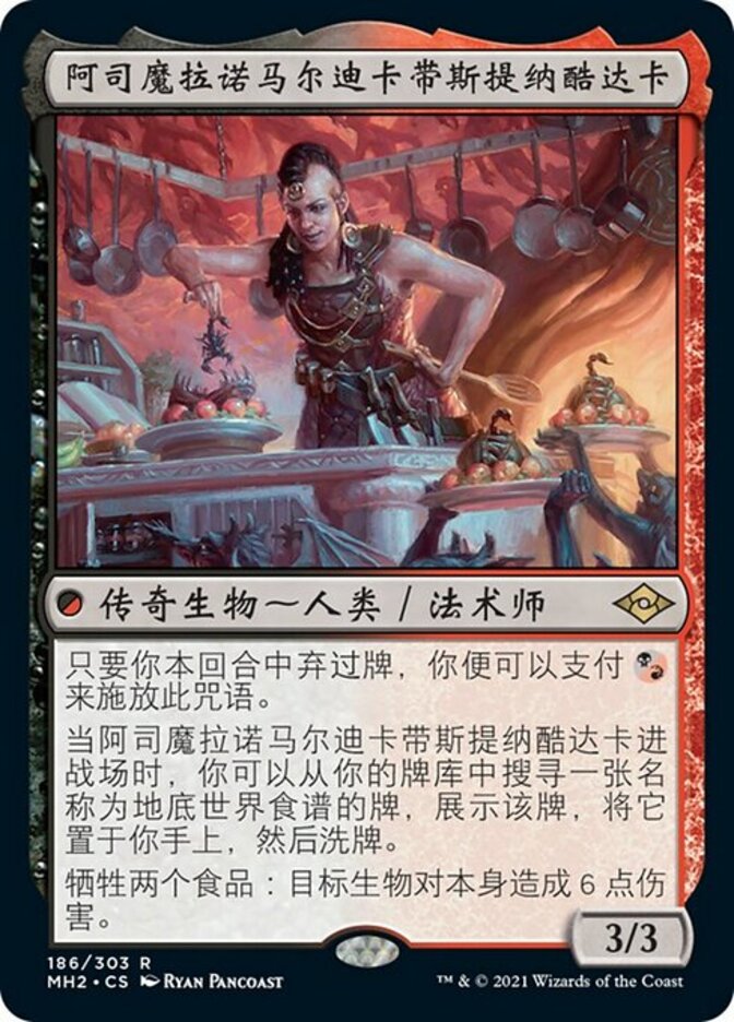 | Rules | As long as you've discarded a card this turn, you may pay to cast this spell. When Asmoranomardicadaistinaculdacar enters the battlefield, you may search your library for a card named The Underworld Cookbook, reveal it, put it into your hand, then shuffle. Sacrifice two Foods: Target creature deals 6 damage to itself. |