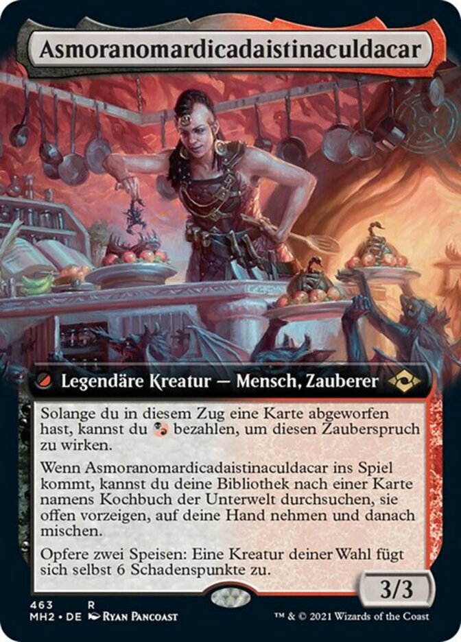 | Rules | As long as you've discarded a card this turn, you may pay to cast this spell. When Asmoranomardicadaistinaculdacar enters the battlefield, you may search your library for a card named The Underworld Cookbook, reveal it, put it into your hand, then shuffle. Sacrifice two Foods: Target creature deals 6 damage to itself. |