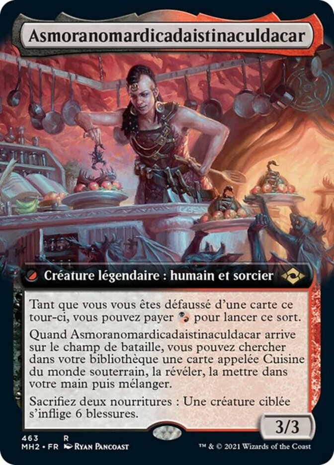 | Rules | As long as you've discarded a card this turn, you may pay to cast this spell. When Asmoranomardicadaistinaculdacar enters the battlefield, you may search your library for a card named The Underworld Cookbook, reveal it, put it into your hand, then shuffle. Sacrifice two Foods: Target creature deals 6 damage to itself. |