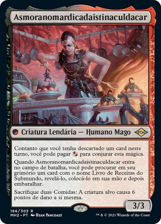 | Rules | As long as you've discarded a card this turn, you may pay to cast this spell. When Asmoranomardicadaistinaculdacar enters the battlefield, you may search your library for a card named The Underworld Cookbook, reveal it, put it into your hand, then shuffle. Sacrifice two Foods: Target creature deals 6 damage to itself. |