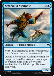 | Rules | Flying (This creature can't be blocked except by creatures with flying or reach.) When Aspiring Aeronaut enters the battlefield, create a 1/1 colorless Thopter artifact creature token with flying. |