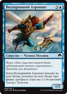 | Rules | Flying (This creature can't be blocked except by creatures with flying or reach.) When Aspiring Aeronaut enters the battlefield, create a 1/1 colorless Thopter artifact creature token with flying. |