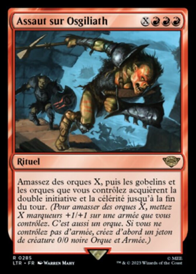 | Rules | Amass Orcs X, then Goblins and Orcs you control gain double strike and haste until end of turn. (To amass Orcs X, put X +1/+1 counters on an Army you control. It's also an Orc. If you don't control an Army, create a 0/0 black Orc Army creature.) |