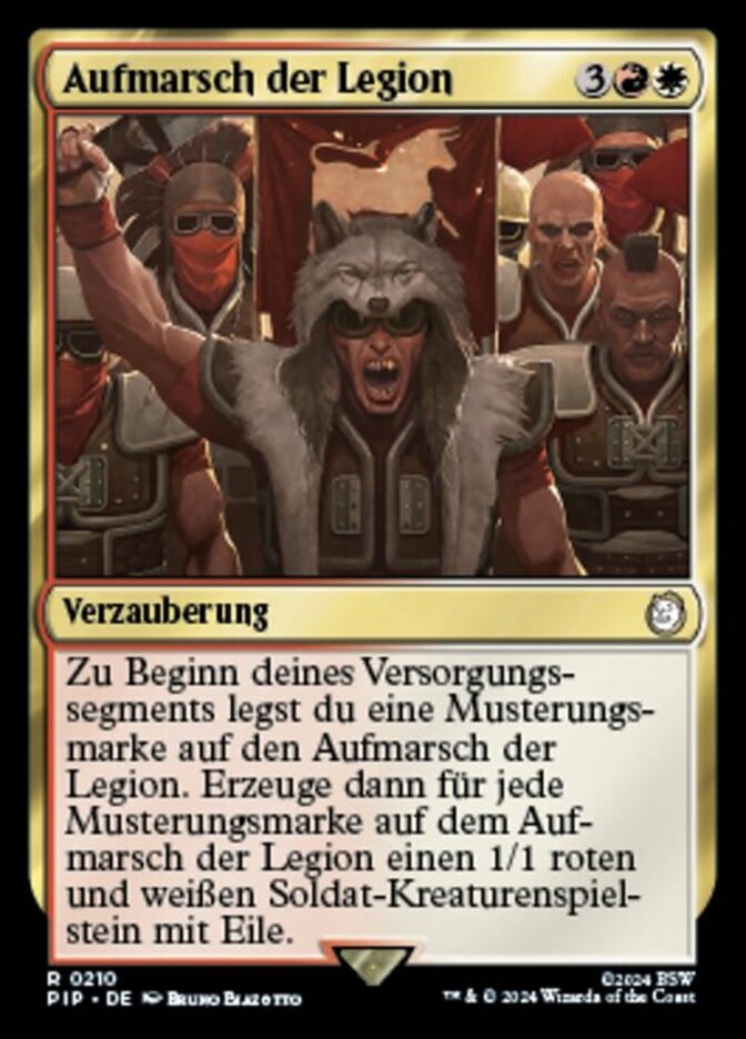 | Rules | At the beginning of your upkeep, put a muster counter on Assemble the Legion. Then create a 1/1 red and white Soldier creature token with haste for each muster counter on Assemble the Legion. |