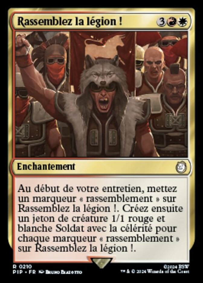 | Rules | At the beginning of your upkeep, put a muster counter on Assemble the Legion. Then create a 1/1 red and white Soldier creature token with haste for each muster counter on Assemble the Legion. |