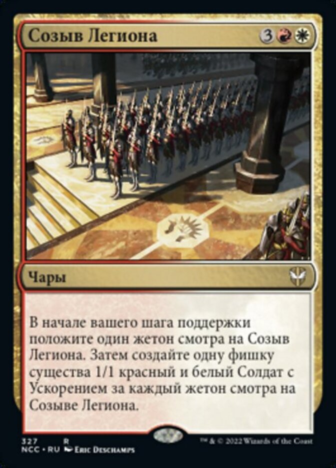 | Rules | At the beginning of your upkeep, put a muster counter on Assemble the Legion. Then create a 1/1 red and white Soldier creature token with haste for each muster counter on Assemble the Legion. |