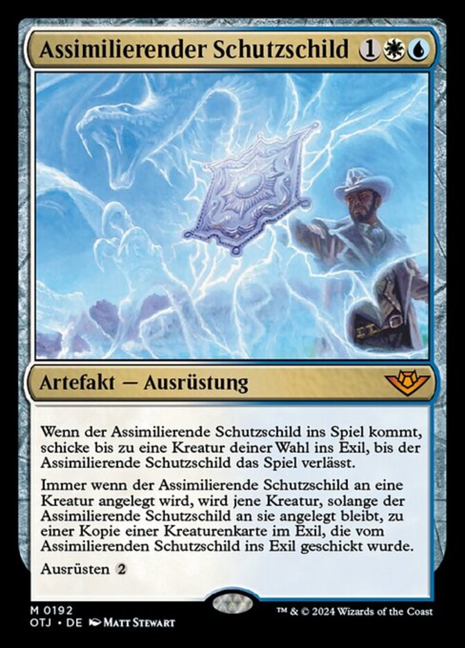 | Rules | When Assimilation Aegis enters the battlefield, exile up to one target creature until Assimilation Aegis leaves the battlefield. Whenever Assimilation Aegis becomes attached to a creature, for as long as Assimilation Aegis remains attached to it, that creature becomes a copy of a creature card exiled with Assimilation Aegis. Equip |