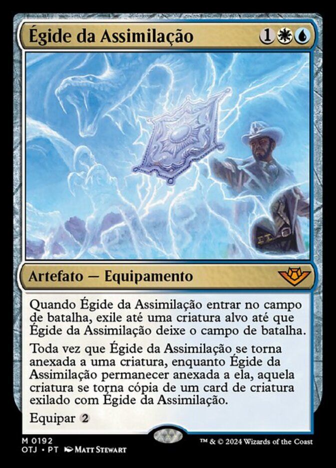 | Rules | When Assimilation Aegis enters the battlefield, exile up to one target creature until Assimilation Aegis leaves the battlefield. Whenever Assimilation Aegis becomes attached to a creature, for as long as Assimilation Aegis remains attached to it, that creature becomes a copy of a creature card exiled with Assimilation Aegis. Equip |