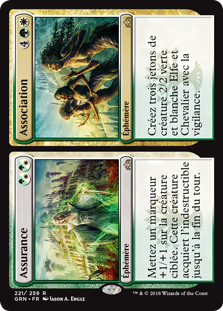 | Rules | Put a +1/+1 counter on target creature. That creature gains indestructible until end of turn. // Create three 2/2 green and white Elf Knight creature tokens with vigilance. |