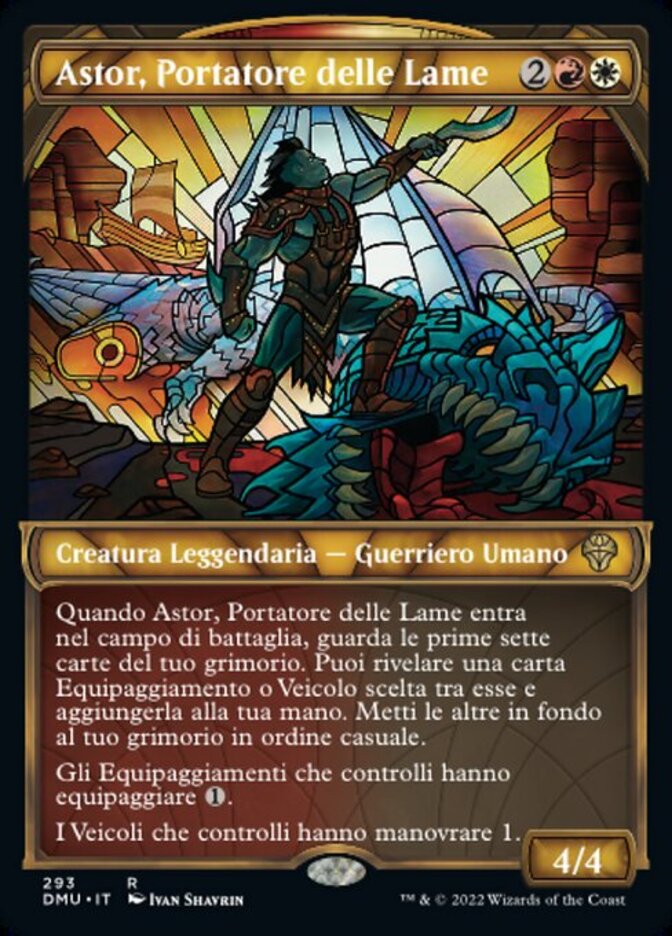 Rules When Astor, Bearer of Blades enters the battlefield, look at the top seven cards of your library. You may reveal an Equipment or Vehicle card from among them and put it into your hand. Put the rest on the bottom of your library in a random order.