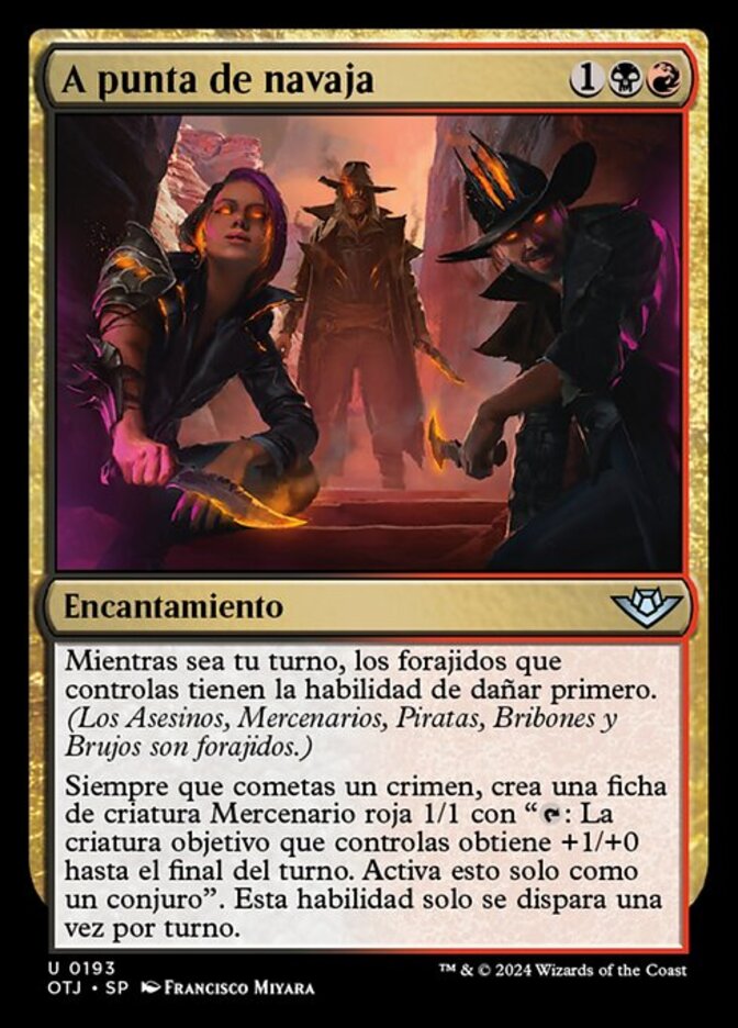 | Rules | As long as it's your turn, outlaws you control have first strike. (Assassins, Mercenaries, Pirates, Rogues, and Warlocks are outlaws.) Whenever you commit a crime, create a 1/1 red Mercenary creature token with ": Target creature you control gets +1/+0 until end of turn. Activate only as a sorcery." This ability triggers only once each turn. |