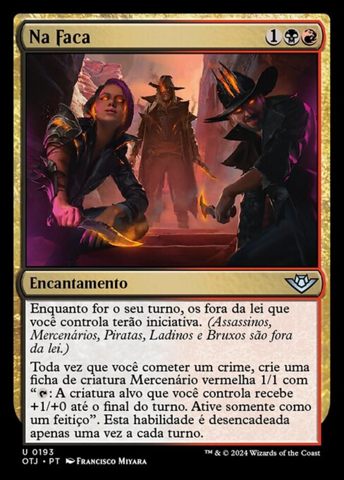 | Rules | As long as it's your turn, outlaws you control have first strike. (Assassins, Mercenaries, Pirates, Rogues, and Warlocks are outlaws.) Whenever you commit a crime, create a 1/1 red Mercenary creature token with ": Target creature you control gets +1/+0 until end of turn. Activate only as a sorcery." This ability triggers only once each turn. |