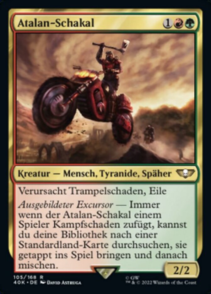 | Rules | Trample, haste Skilled Outrider — Whenever Atalan Jackal deals combat damage to a player, you may search your library for a basic land card, put it onto the battlefield tapped, then shuffle. |