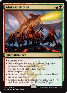 | Rules | Choose two — • Your opponents can't gain life this turn. • Atarka's Command deals 3 damage to each opponent. • You may put a land card from your hand onto the battlefield. • Creatures you control get +1/+1 and gain reach until end of turn. |