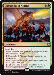 | Rules | Choose two — • Your opponents can't gain life this turn. • Atarka's Command deals 3 damage to each opponent. • You may put a land card from your hand onto the battlefield. • Creatures you control get +1/+1 and gain reach until end of turn. |