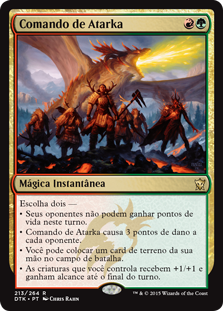 | Rules | Choose two — • Your opponents can't gain life this turn. • Atarka's Command deals 3 damage to each opponent. • You may put a land card from your hand onto the battlefield. • Creatures you control get +1/+1 and gain reach until end of turn. |