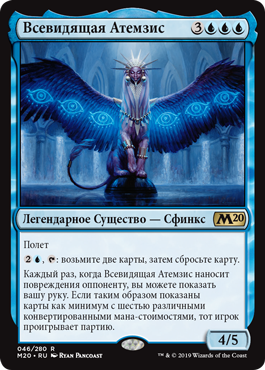 | Rules | Flying , : Draw two cards, then discard a card. Whenever Atemsis, All-Seeing deals damage to an opponent, you may reveal your hand. If cards with at least six different mana values are revealed this way, that player loses the game. |