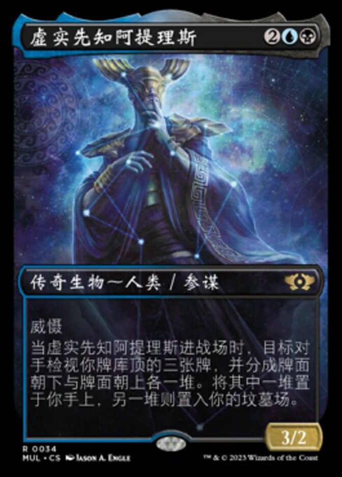 | Rules | Menace When Atris, Oracle of Half-Truths enters the battlefield, target opponent looks at the top three cards of your library and separates them into a face-down pile and a face-up pile. Put one pile into your hand and the other into your graveyard. |