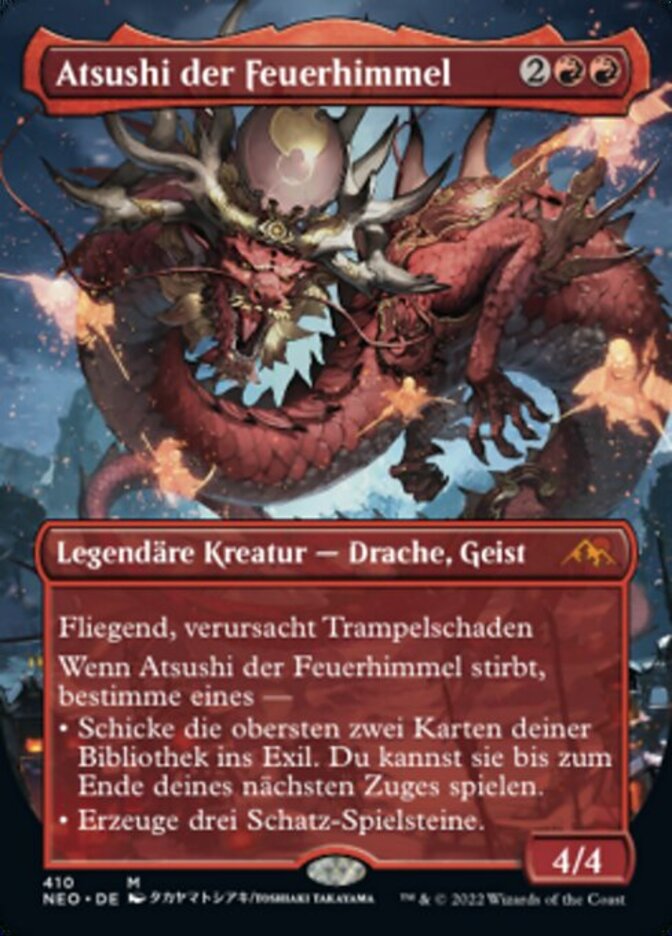 | Rules | Flying, trample When Atsushi, the Blazing Sky dies, choose one — • Exile the top two cards of your library. Until the end of your next turn, you may play those cards. • Create three Treasure tokens. |