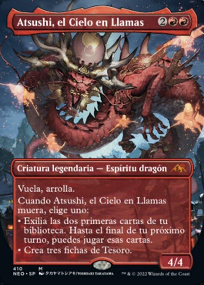 | Rules | Flying, trample When Atsushi, the Blazing Sky dies, choose one — • Exile the top two cards of your library. Until the end of your next turn, you may play those cards. • Create three Treasure tokens. |