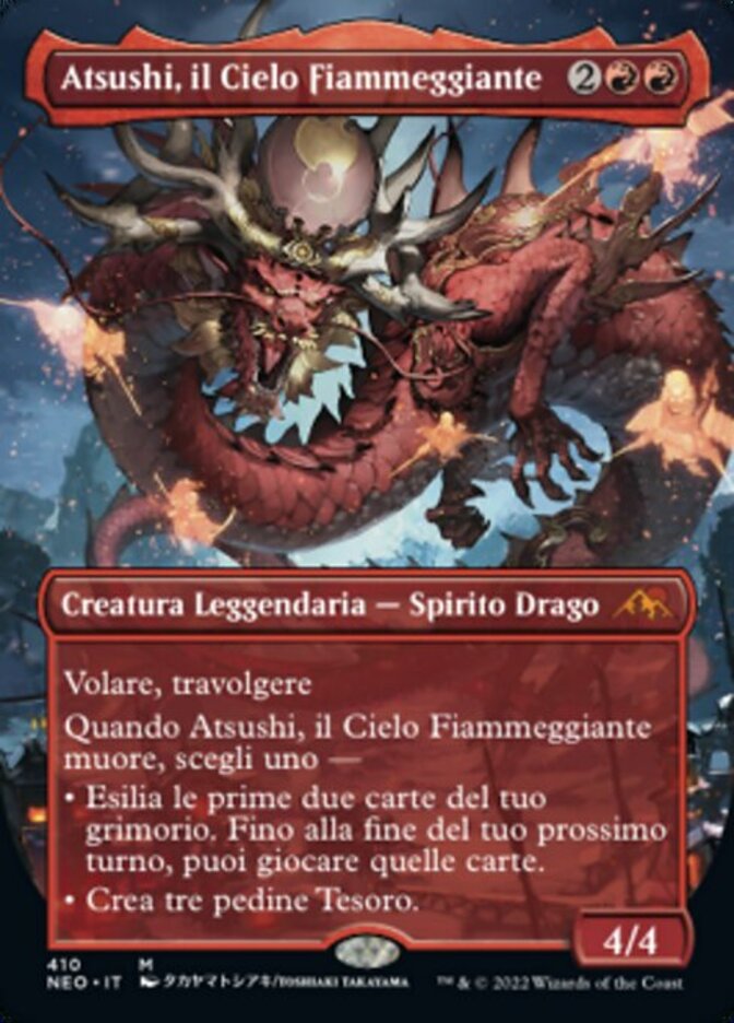 | Rules | Flying, trample When Atsushi, the Blazing Sky dies, choose one — • Exile the top two cards of your library. Until the end of your next turn, you may play those cards. • Create three Treasure tokens. |