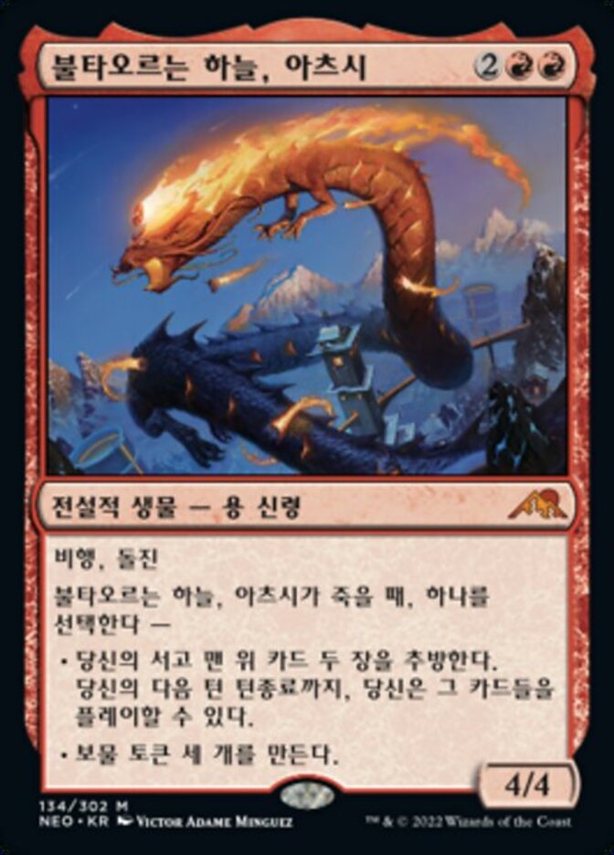 | Rules | Flying, trample When Atsushi, the Blazing Sky dies, choose one — • Exile the top two cards of your library. Until the end of your next turn, you may play those cards. • Create three Treasure tokens. |