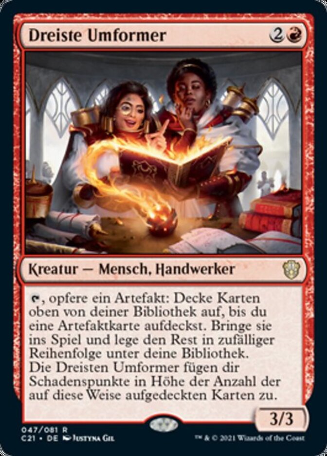 | Rules | , Sacrifice an artifact: Reveal cards from the top of your library until you reveal an artifact card. Put that card onto the battlefield and the rest on the bottom of your library in a random order. Audacious Reshapers deals damage to you equal to the number of cards revealed this way. |