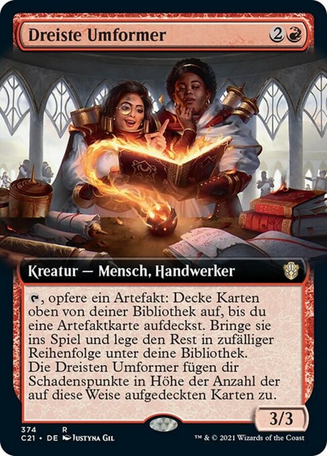 | Rules | , Sacrifice an artifact: Reveal cards from the top of your library until you reveal an artifact card. Put that card onto the battlefield and the rest on the bottom of your library in a random order. Audacious Reshapers deals damage to you equal to the number of cards revealed this way. |