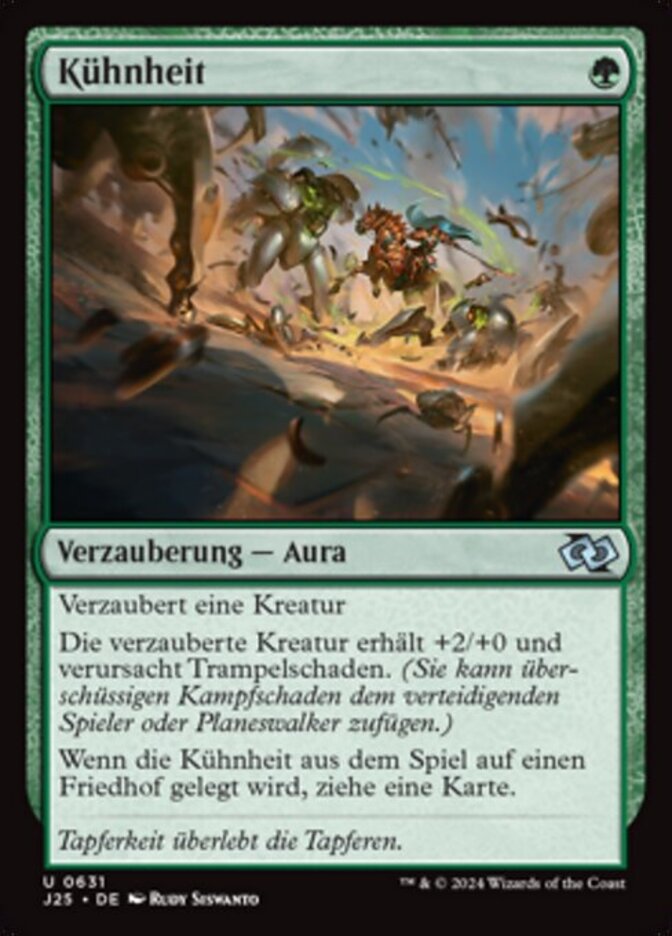 | Rules | Enchant creature Enchanted creature gets +2/+0 and has trample. When Audacity is put into a graveyard from the battlefield, draw a card. |