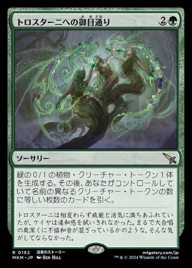 | Rules | Create a 0/1 green Plant creature token, then draw cards equal to the number of differently named creature tokens you control. |