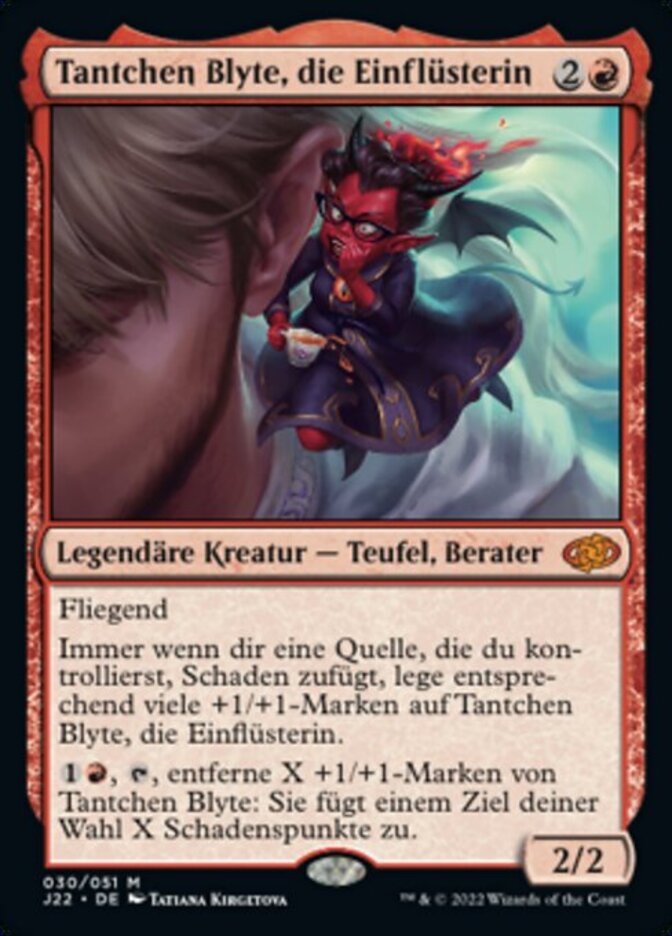 | Rules | Flying Whenever a source you control deals damage to you, put that many +1/+1 counters on Auntie Blyte, Bad Influence. , , Remove X +1/+1 counters from Auntie Blyte: It deals X damage to any target. |