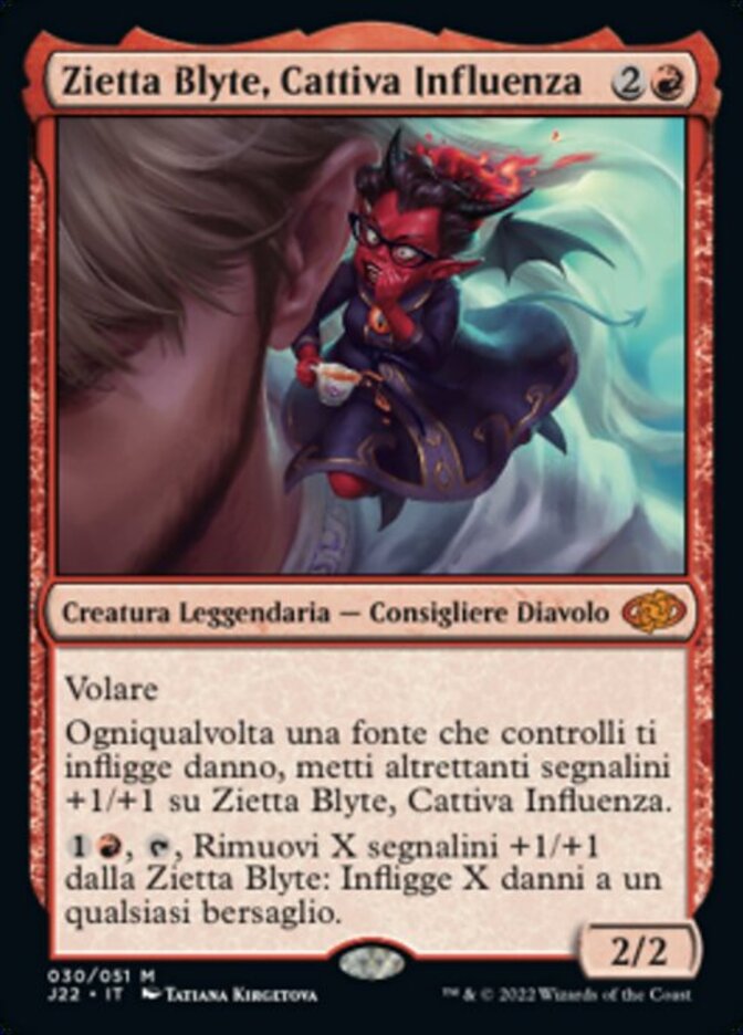 | Rules | Flying Whenever a source you control deals damage to you, put that many +1/+1 counters on Auntie Blyte, Bad Influence. , , Remove X +1/+1 counters from Auntie Blyte: It deals X damage to any target. |