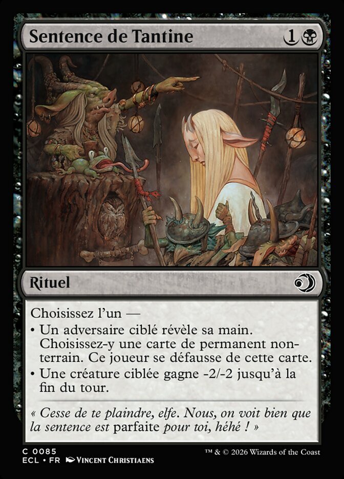 | Rules | Choose one — • Target opponent reveals their hand. You choose a nonland permanent card from it. That player discards that card. • Target creature gets -2/-2 until end of turn. |