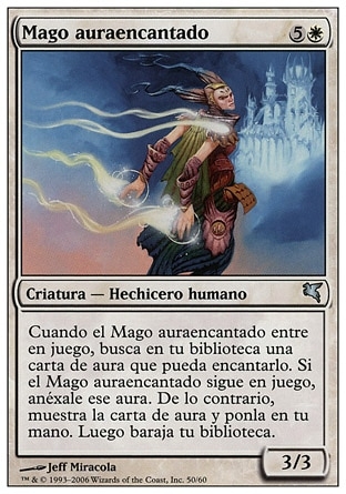 | Rules | When Auratouched Mage enters the battlefield, search your library for an Aura card that could enchant it. If Auratouched Mage is still on the battlefield, put that Aura card onto the battlefield attached to it. Otherwise, reveal the Aura card and put it into your hand. Then shuffle. |